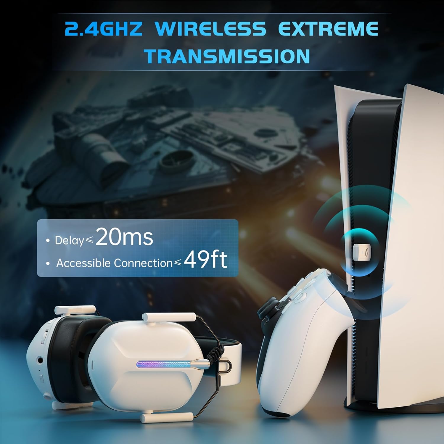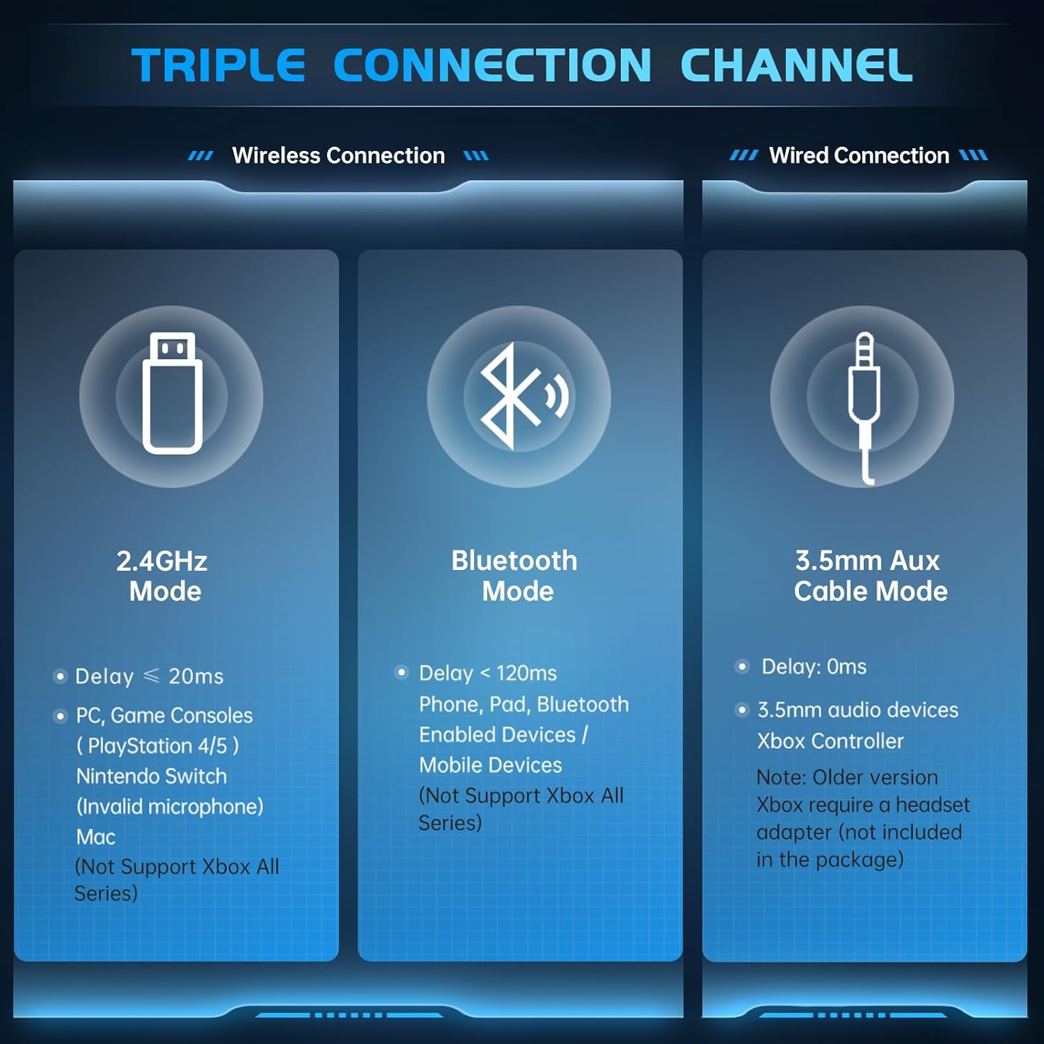 - 🎧【3-in-1 Connectivity & Multi-platform Compatibility】The 2.4GHz mode of this ps5 headset wireless can be compatible with PS5, PS4, PC, switch, Mac, Laptop, Computer with the USB adapter (enabling seamless connectivity within 49ft). Bluetooth 5.3 mode of this ps5 headset with mic is compatible with Mobile phone, Tablet, iPad and other smart VR devices. In addition, the wireless gaming headset pc comes with an additional 3.5mm auxiliary cable for use with the Xbox One/X, S-Series, and other game controllers with a 3.5mm connector. (ALL Xbox Series ONLY Support Wired Mode)
